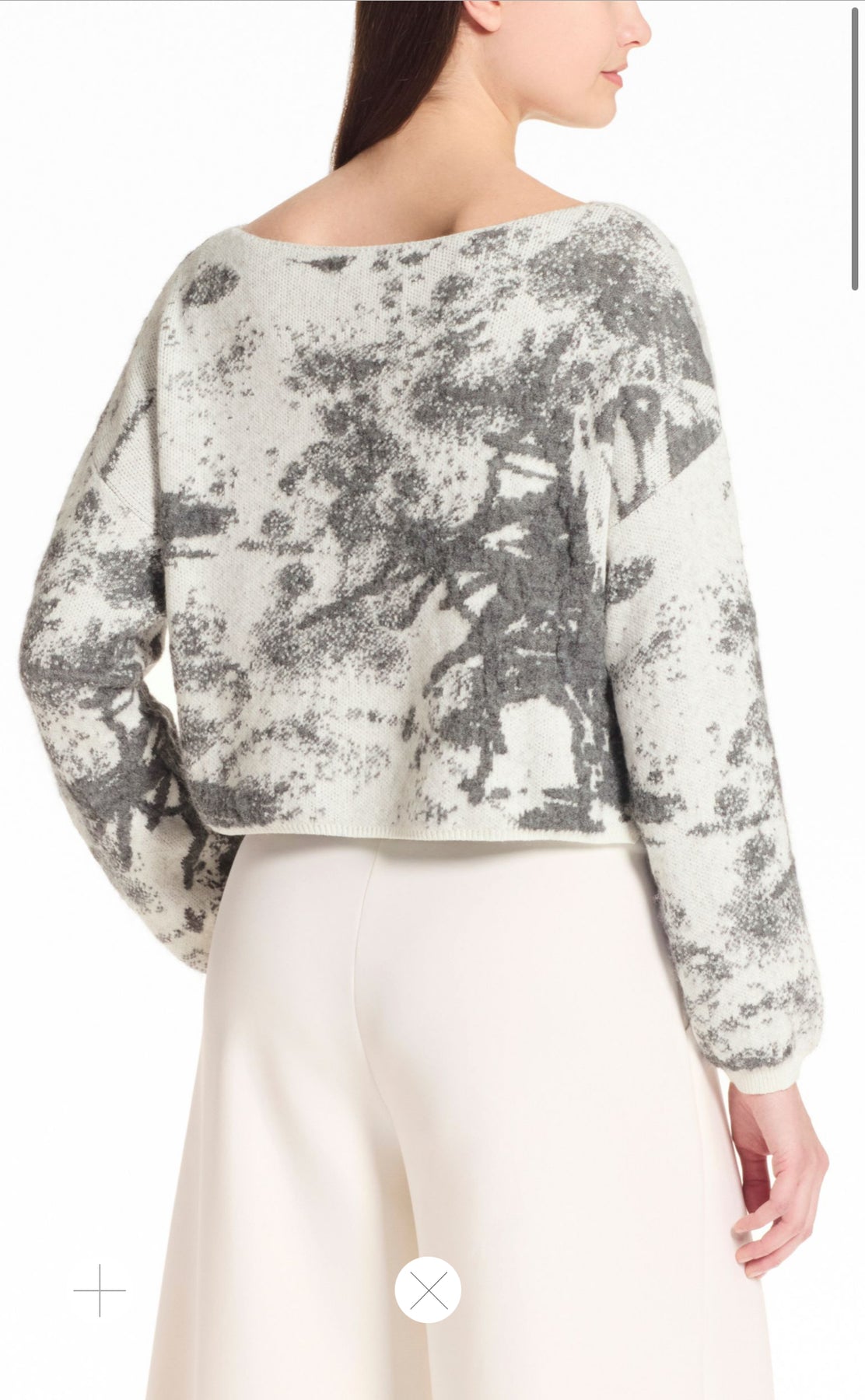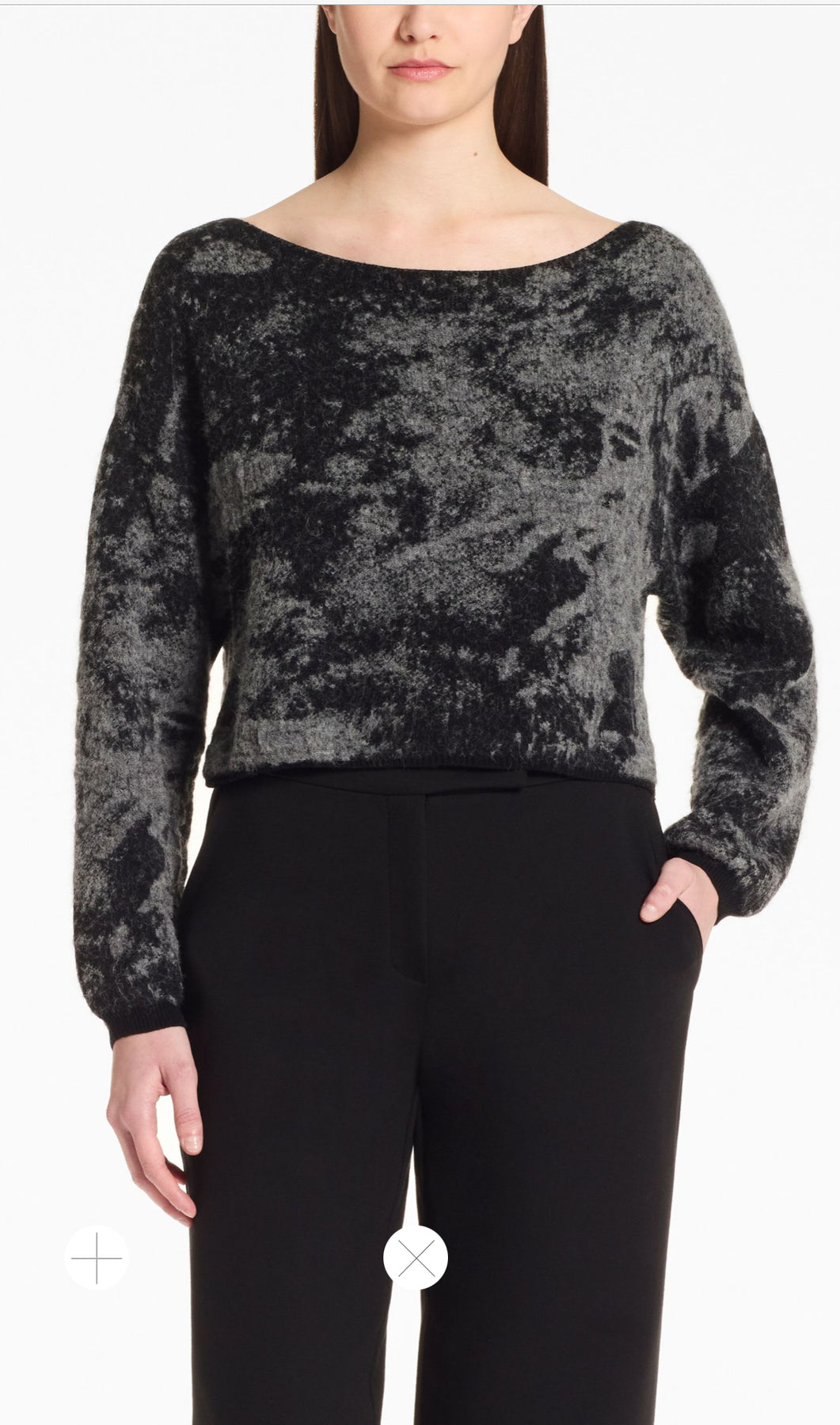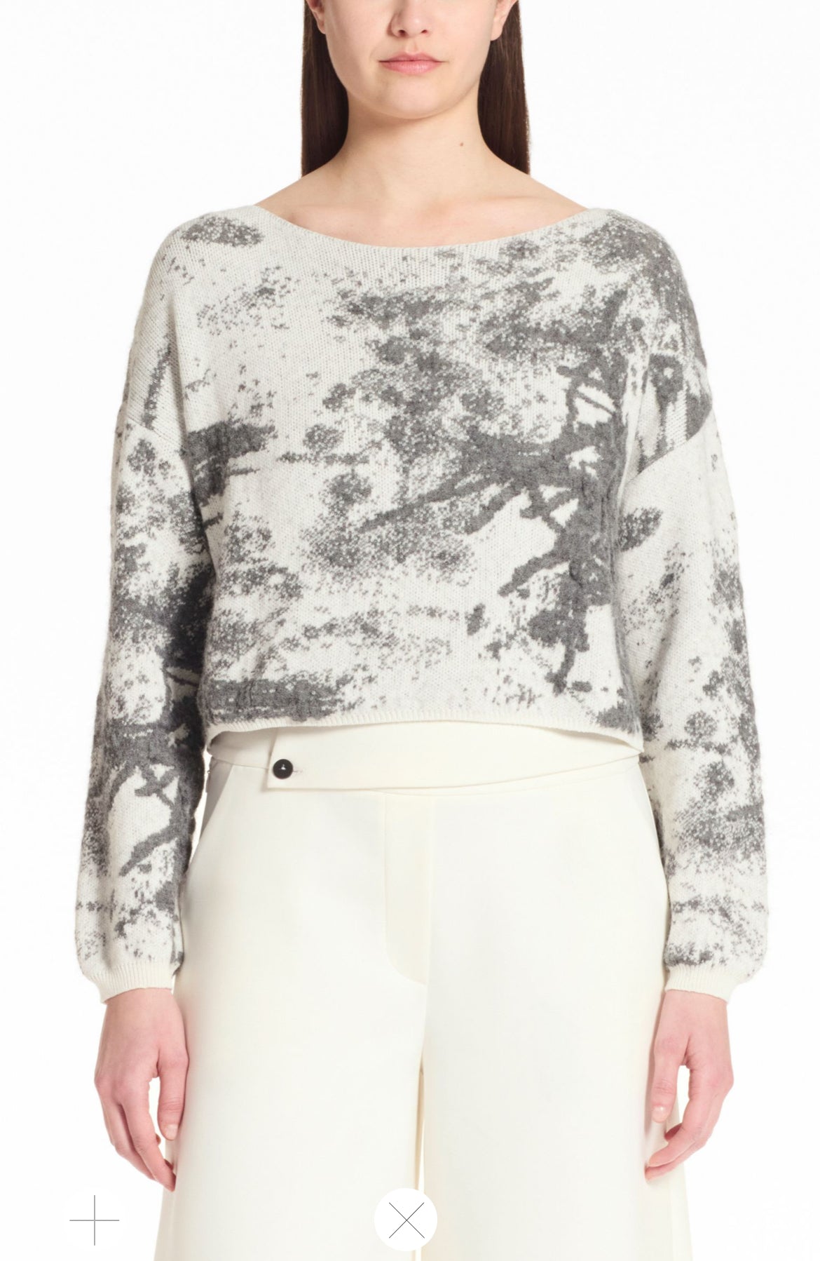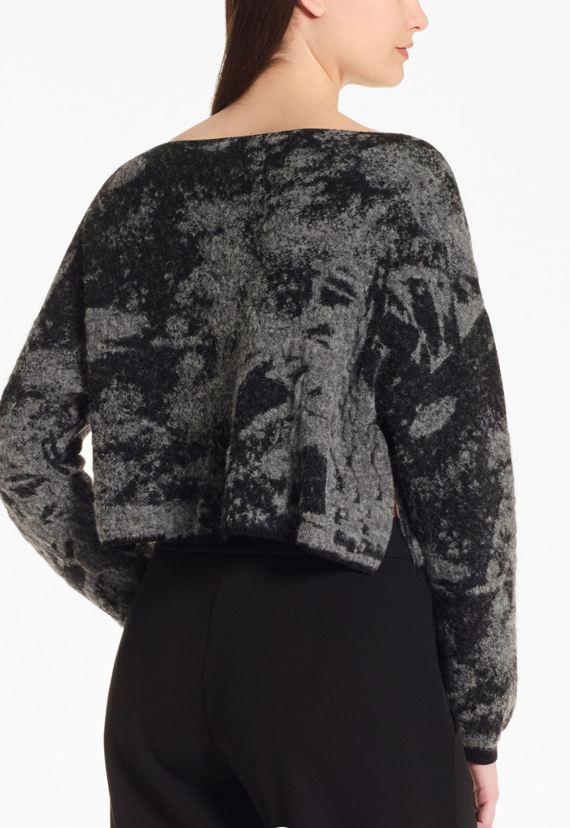 This cropped sweater features a wide boatneck, dropped shoulders, and sculpted sleeves for an effortlessly bold silhouette. Raised accents in the jacquard create depth, while blended baby alpaca yarns offer a soft hand and fluid drape.