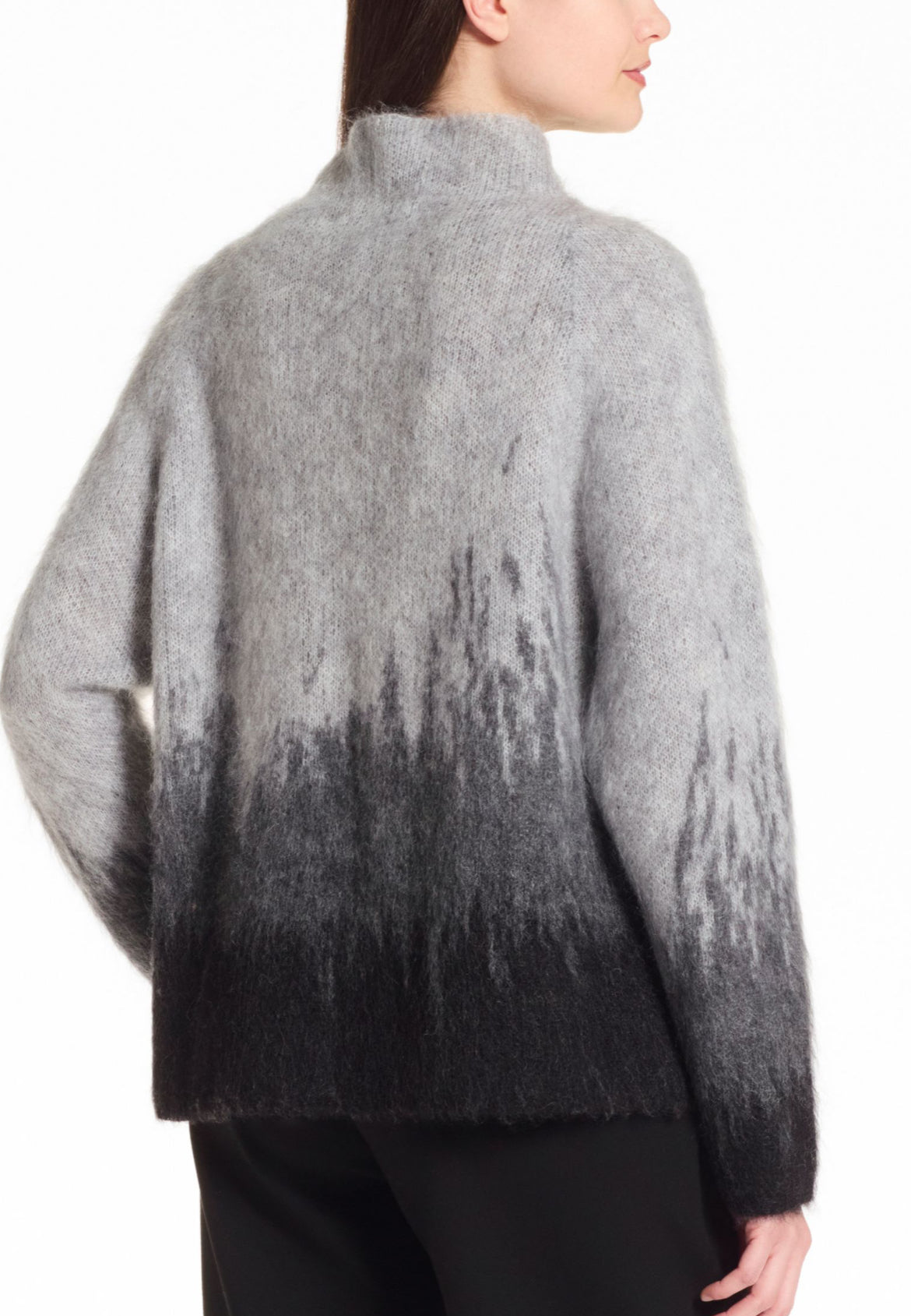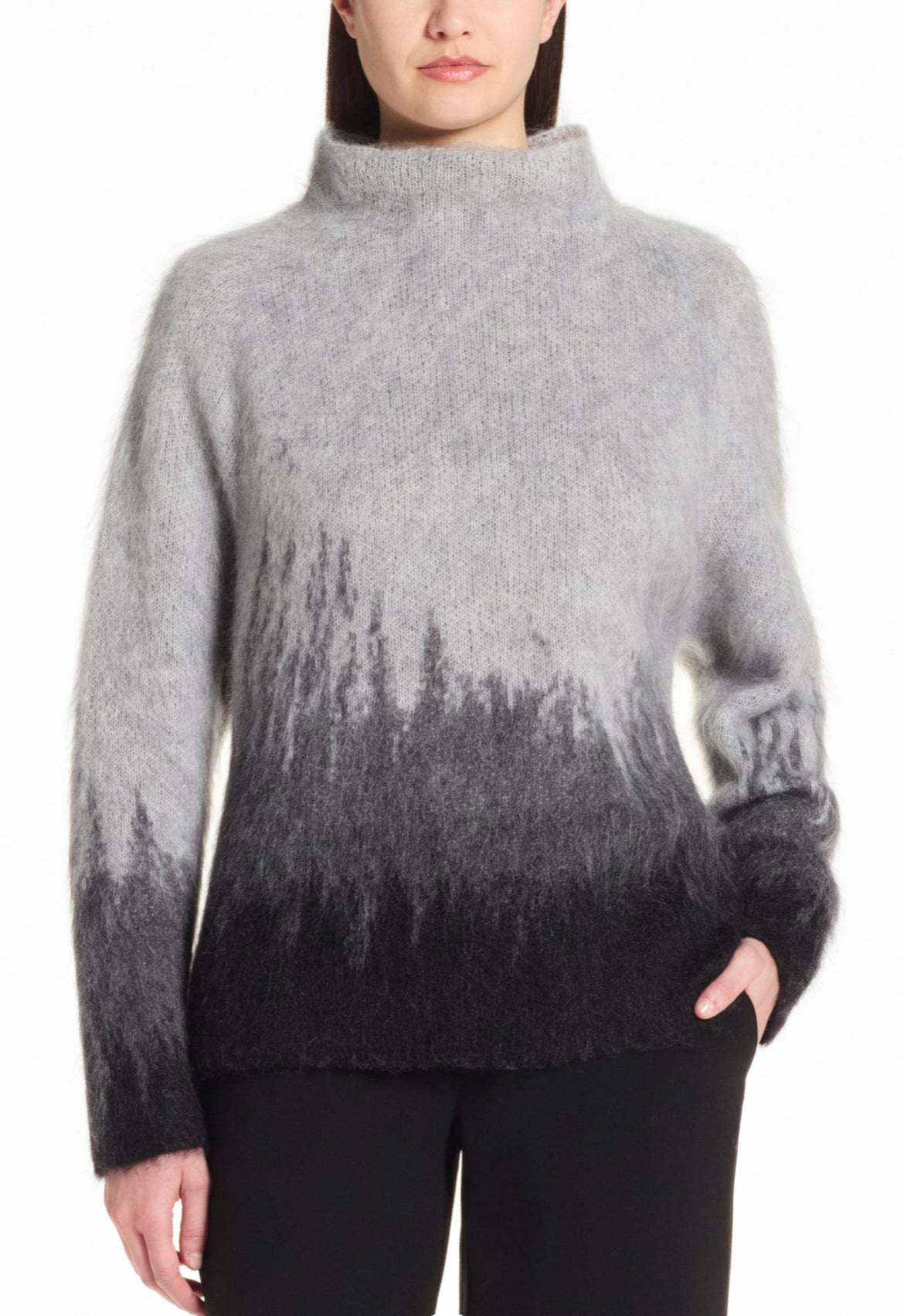 Crafted from a fine kid mohair blend, this funnel-neck sweater offers warmth with a sustainable touch. A soft ombré motif in brushed mohair produces a dreamlike effect, reminiscent of impressionist painting.